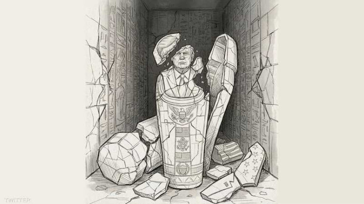 وبحسب الرسم المرفق بالتغريدة، فقد كان هناك تابوت فرعوني يتضمن رسما لترامب داخل غرفة أشبه بمقبرة فرعونية، وكان التابوت محطما وحوله بعض الحجارة المحطمة أيضا، والتي تحمل شعارات وأعلام أميركية.