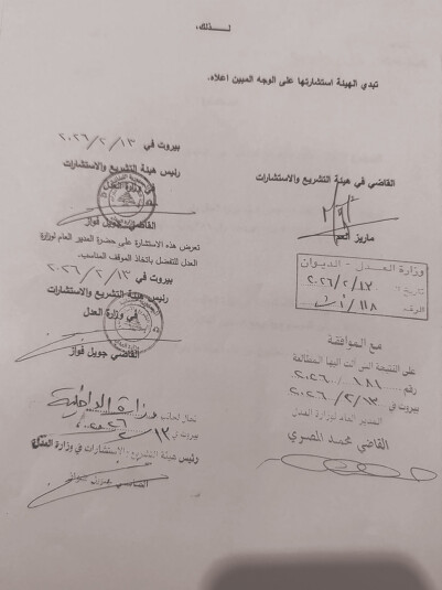 إنّ هيئة التشريع والاستشارات في وزارة العدل، بالإشارة إلى الموضوع والمرجع المبينين أعلاه، تبين أنكم تعرضون وتطلبون من هذه الهيئة ما يلي: