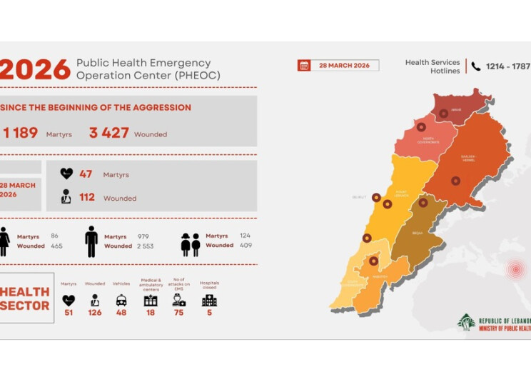 نشرت وزارة الصحة العامة التقرير اليومي الصادر عن مركز عمليات طوارئ الصحة حول تطورات العدوان الإسرائيلي على لبنان، وجاء فيه أن العدد الإجمالي للشهداء منذ 2 آذار حتى 28 آذار ارتفع إلى 1189، كما ارتفع عدد الجرحى الى 3427.
