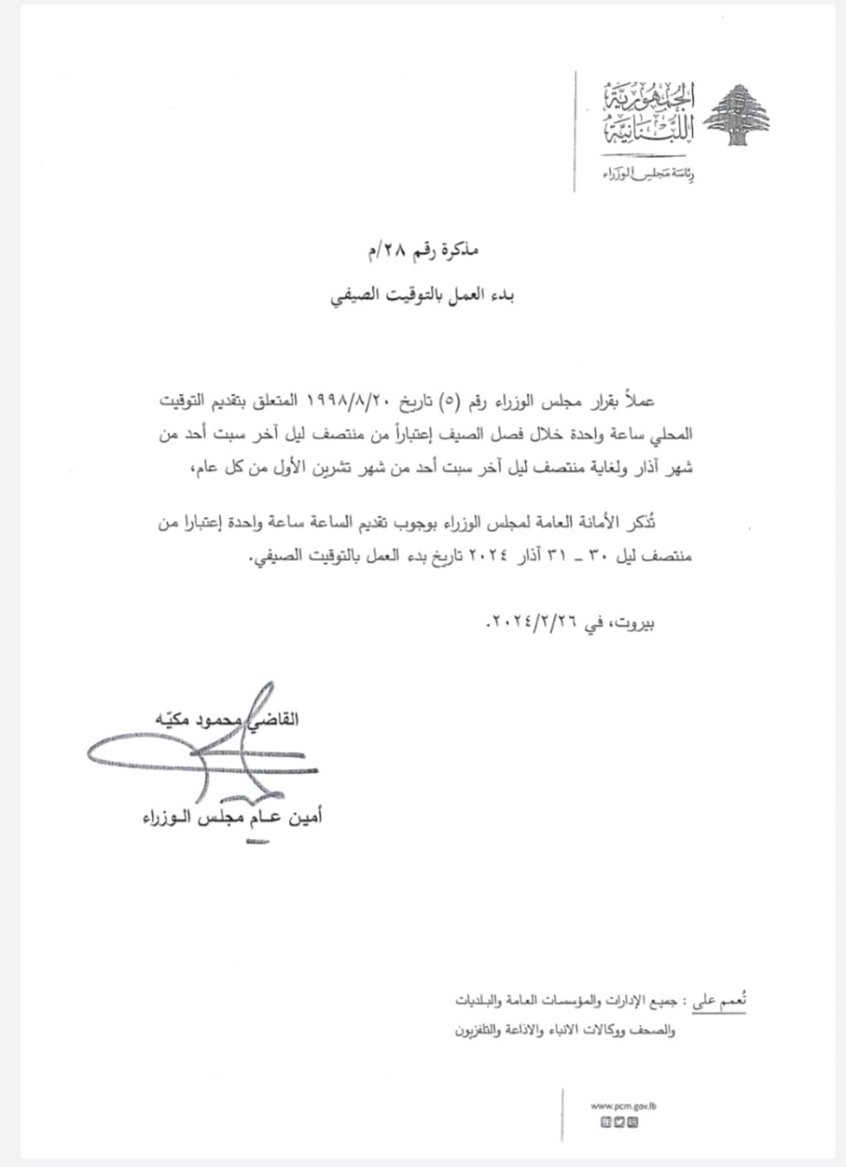 ذكّرت الامانة العامة لمجلس الوزراء، بوجوب تقديم الساعة ساعة واحدة اعتبار من منتصف ليل 30 – 31 آذار 2024.