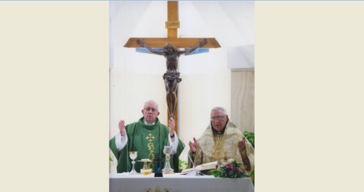 وختم: "اكرّر تعزيتي لكلّ واحد منكم وأرفع صلاتي معكم إلى الربّ القدير، سيّد الأحياء والأموات، منشدًا: "مع القدّيسين أرح أيّها المسيح، نفس عبدك البابا فرنسيس، حيث لا وجع ولا حزن ولا تنهّد بل حياة لا نهاية لها".