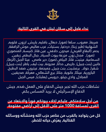 أصدر الجيش الإسرائيلي إنذارا إلى سكان لبنان في القرى التالية: "صريفا، معروب، سلعا (صور)، دبعال، بافليه، باريش، ارزون، قلويه، الشهابية (طير زبنا)، دردغيا، بستيات، عرب صاليم، حوش الرافقة، يحمر (البقاع الغربي)، ميدون، دلافي، عين قانا، كنيسة، المنصوري (صور)، مجدل زون، مزرعة بيوت السياد، جبال البطم، زبقين، السماعية، عيتيت، قانا، البياض (صور)، دير عامص، عيتا الجبل (الزط)، حانين (بنت جبيل)، حاريص، حداثا، محرونة، بيت ليف، ياطر (بنت جبيل)، شقرا، حولا، برعشيت، بنت جبيل، جميجمة، عيترون، صفد البطيخ، البازورية، عيناثا، حانوية، جناتا، برج الشمالي، معركة، صديقين، المجادل، وادي جيلو، درويس (بعلبك)، ميس الجبل".