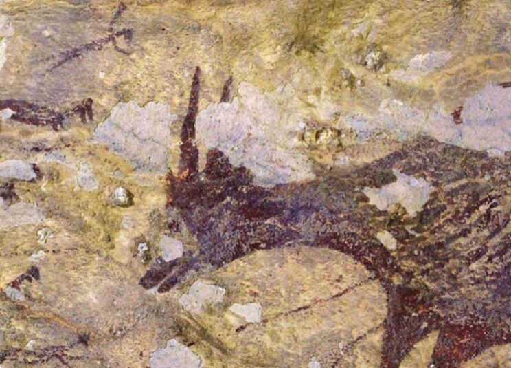 ويجسّد العمل الفني مطاردة بين صيادين «أشباه بشر» وحيوانات برية. يُقال إنه رُسم قبل نحو 44 ألف عام في جزيرة سولاويسي، وفقاً لفريق علمي قاده الباحثان ماكسيم أوبرت وآدم بروم. ووفقًا لموقع «نيتشر» المتخصّص في الأخبار العلمية، يُعتبر العمل الفني هو الأول من نوعه الذي يرصد عملية صيد.
