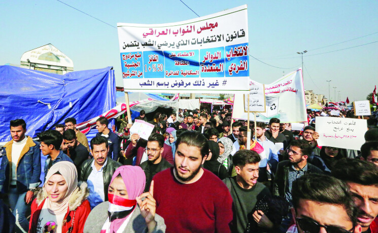 وكان المتظاهرون قد رحّبوا في نهاية تشرين الثاني باستقالة حكومة عادل عبد المهدي. واليوم، هم يريدون إسقاط رئيس البرلمان محمد الحلبوسي ورئيس الجمهورية برهم صالح، اللذين يتهمونهما بـ«المماطلة».