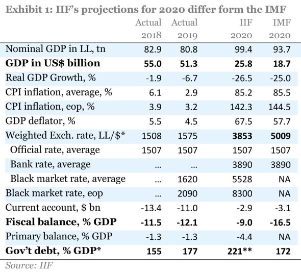 تختلف توقعات معهد التمويل الدولي للعام 2020 بالنسبة للبنان عن توقعات صندوق النقد الدولي، بحسب أحدث تقرير أعدّه كبير الاقتصاديين لمنطقة الشرق الأوسط وشمال أفريقيا في معهد التمويل الدولي غربيس ايراديان، الذي رأى انّ على لبنان تنفيذ إصلاحات كبيرة لتجنّب مصير الدول الفاشلة، مثل فنزويلا، متوقعاً أن يَنكمِش الاقتصاد اللبناني بنسبة 26.5 في المئة في العام 2020، مُترافقاً مع انخفاض حاد في سعر الصرف في السوق الموازية، ما سيقلّص الناتج المحلي الإجمالي بمقدار النصف بالدولار الأميركي (جدول 1).